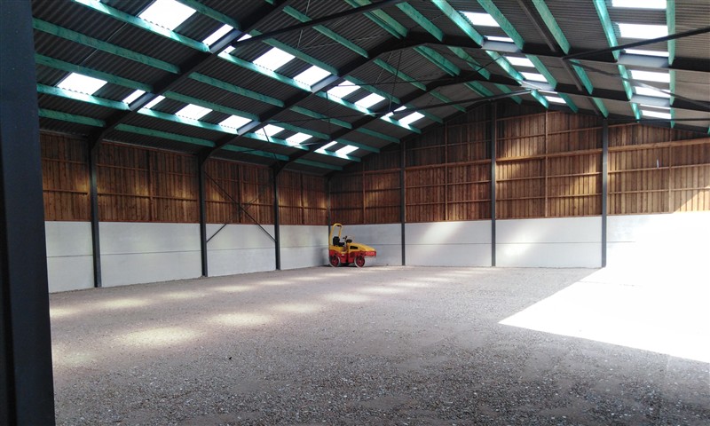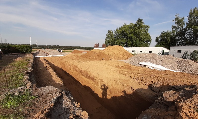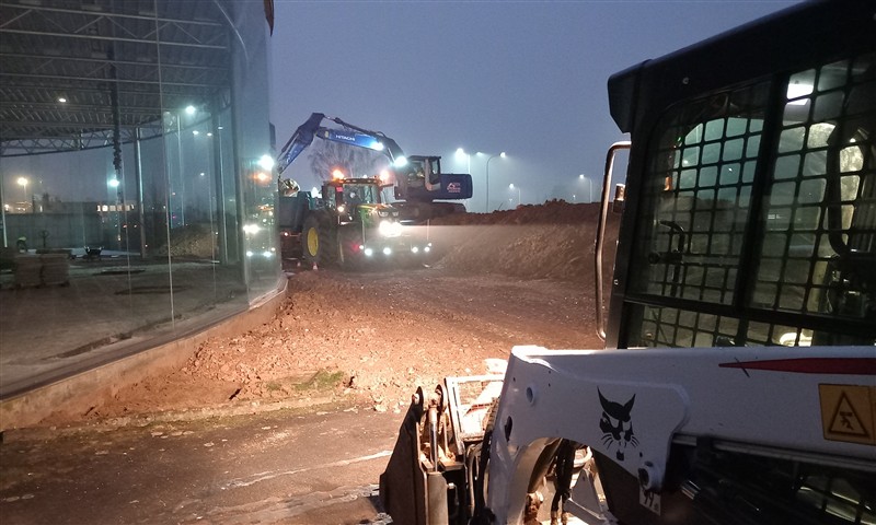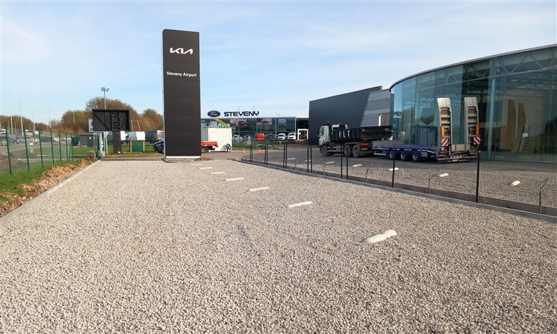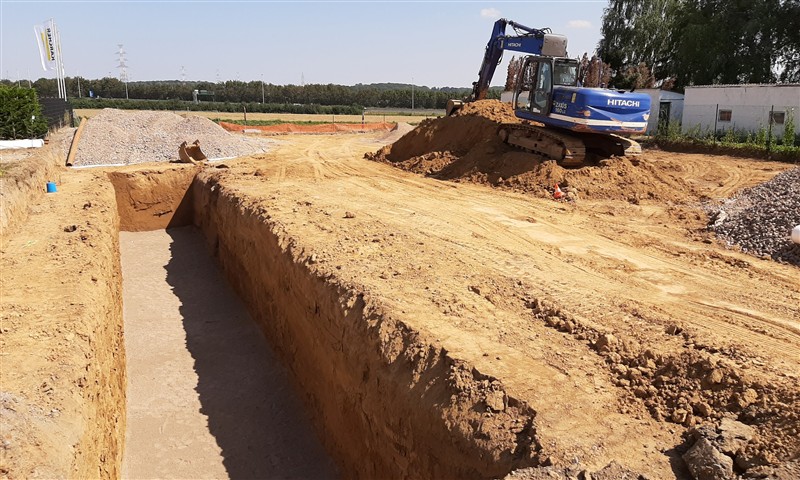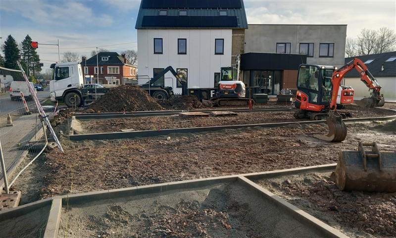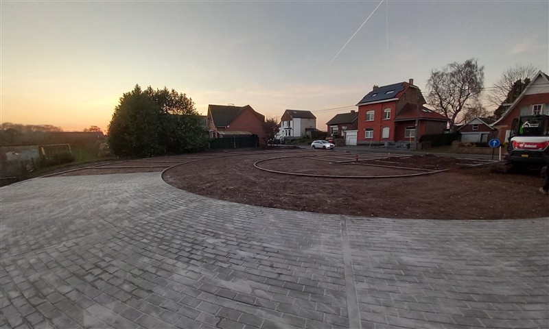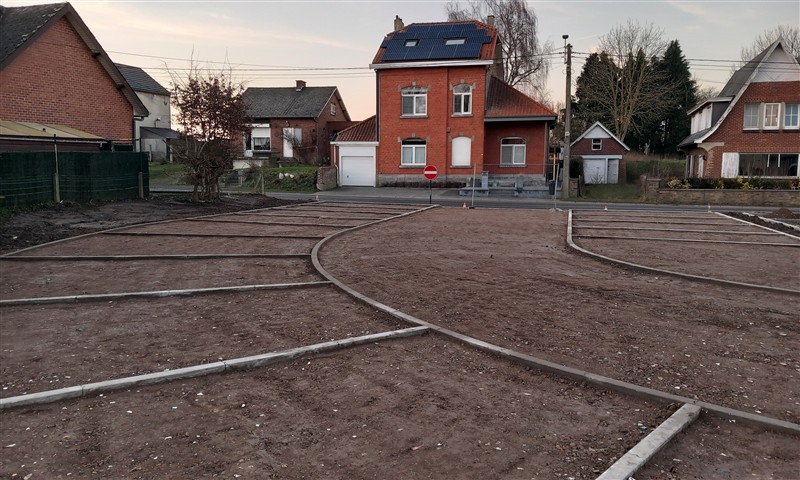 Chantier de terrassement pour un parking commercial de +-2000m². Terrassement et évacuation des terres, pose de géotextile et pose d'empierrement.